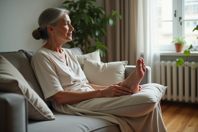Première mesure concrète : dès que possible, prenez le réflexe de surélever vos jambes. Quelques minutes, plusieurs fois par jour, allongé avec les jambes surélevées sur un coussin, suffisent à relancer le retour veineux et à atténuer le gonflement. L’effet apaisant est rapide, surtout après une longue journée debout ou en cas de chaleur.